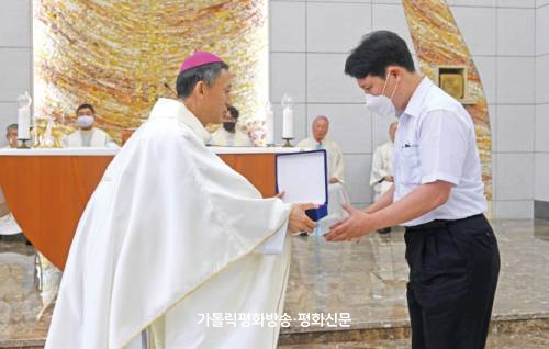 | ▲ 유경촌 주교가 7월 29일 고 한정관 신부 선종 1주기 추모 미사에서 유가족 대표인 고인의 큰조카에게 유산 기부 감사패를 전달하고 있다. |