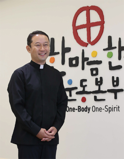 김정환 신부가 서울 명동 가톨릭회관에 있는 한마음한몸운동본부 사무실에서 무료급식소에 관해 설명하고 있다. [한주형 기자]